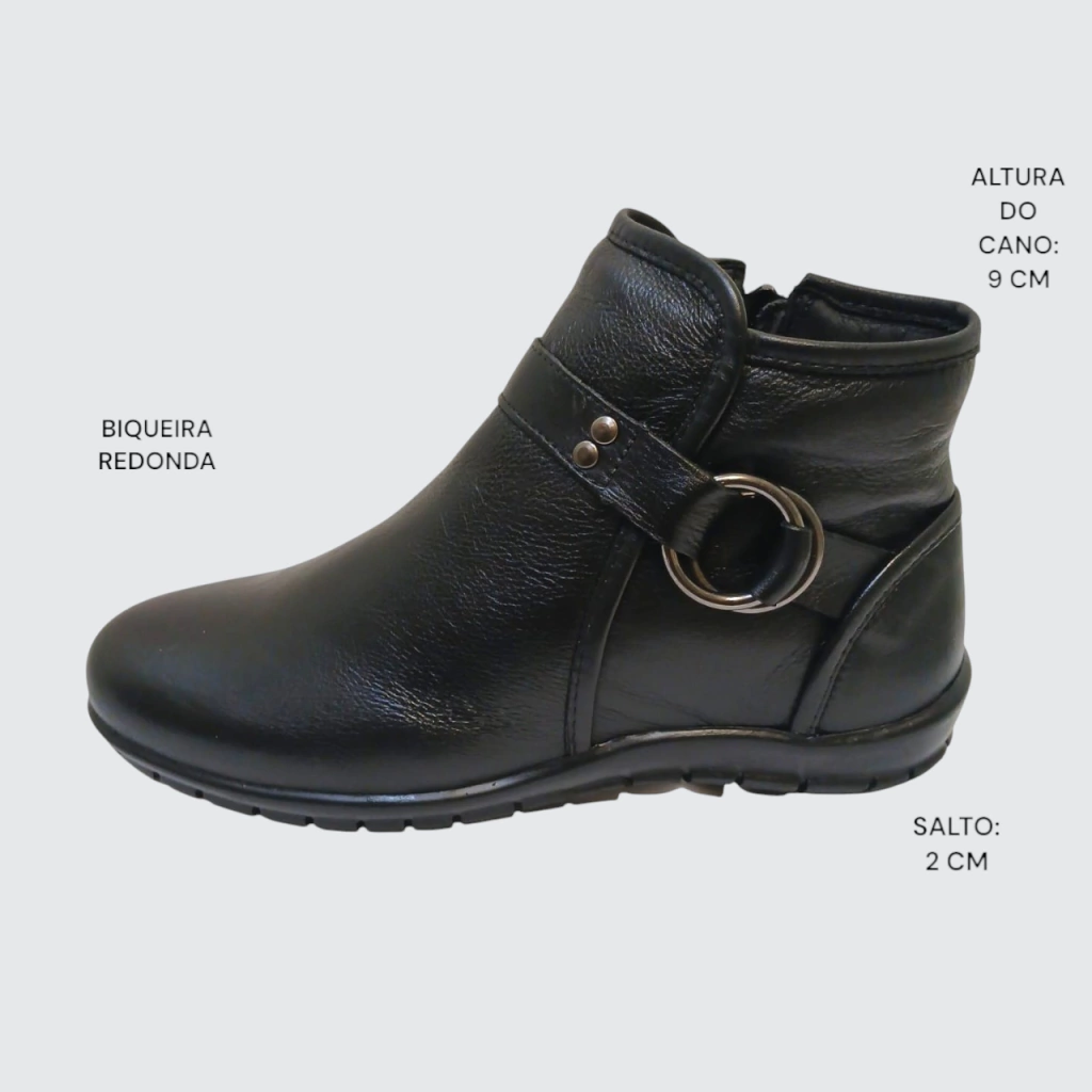 Bota em couro,biqueira redonda,cano curto,forrada em cacharrel,fecho em zíper na lateral interna,palmilha em couro macio,solado em drive emborrachado.