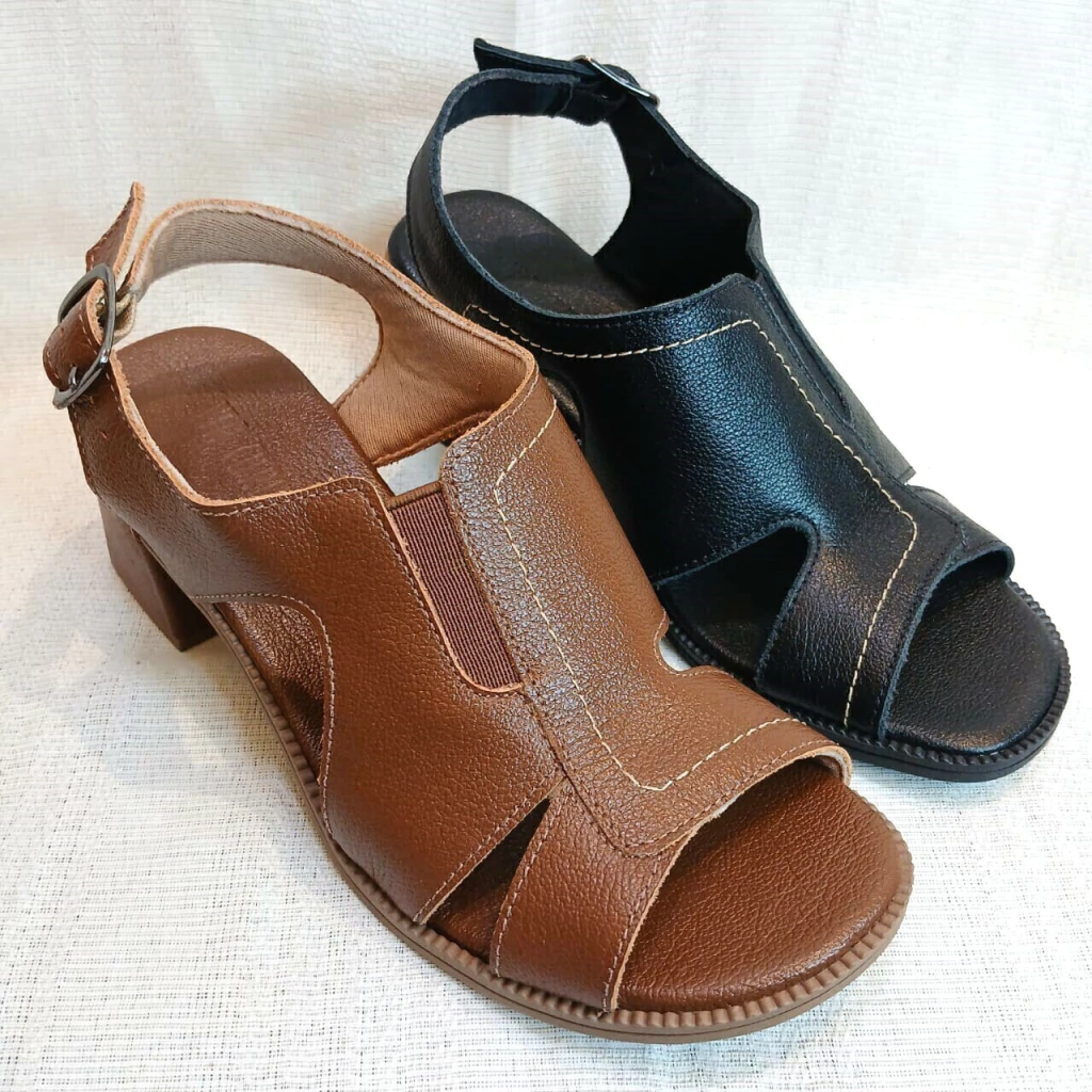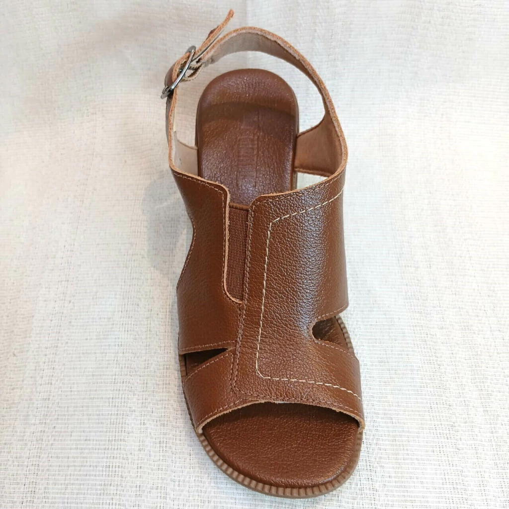 Sandália de couro,dedos livres,frente arredondada,forrada em cacharrel,cabedal vazado com elástico ajustável,fecho em fivela,palmilha em couro,salto bloco alto,solado antiderrapante.