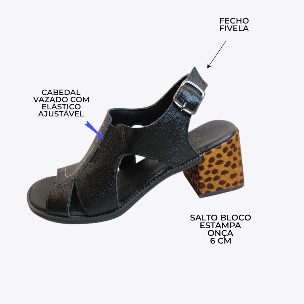 Com um toque ousado e cheio de personalidade, esta sandália social é perfeita para quem quer brilhar em qualquer ocasião. Seu design charmoso e glamouroso destaca-se pelo salto bloco com estampa de onça, que adiciona estilo e atitude ao look, sem abrir mão do conforto.