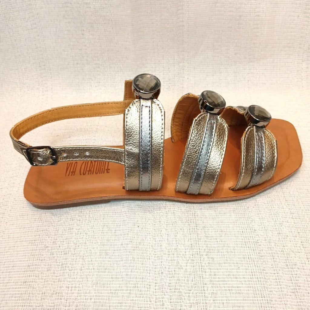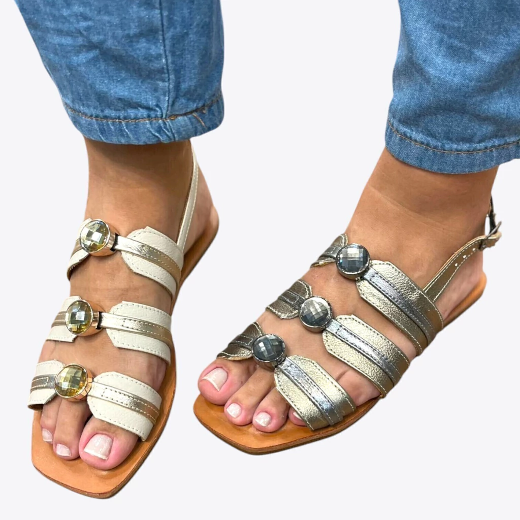 Sandália de couro,com detalhe de pedras no cabedal,dedos livres,frente quadrada,fecho fivela na altura do calcanhar,forrada em couro macio,palmilha em couro macio,solado antiderrapante.