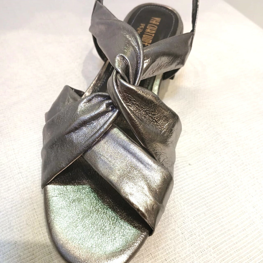 Com acabamento em couro metalizado, essa sandália une brilho e sofisticação na medida certa. Ideal para quem deseja um toque glamouroso sem abrir mão do conforto.