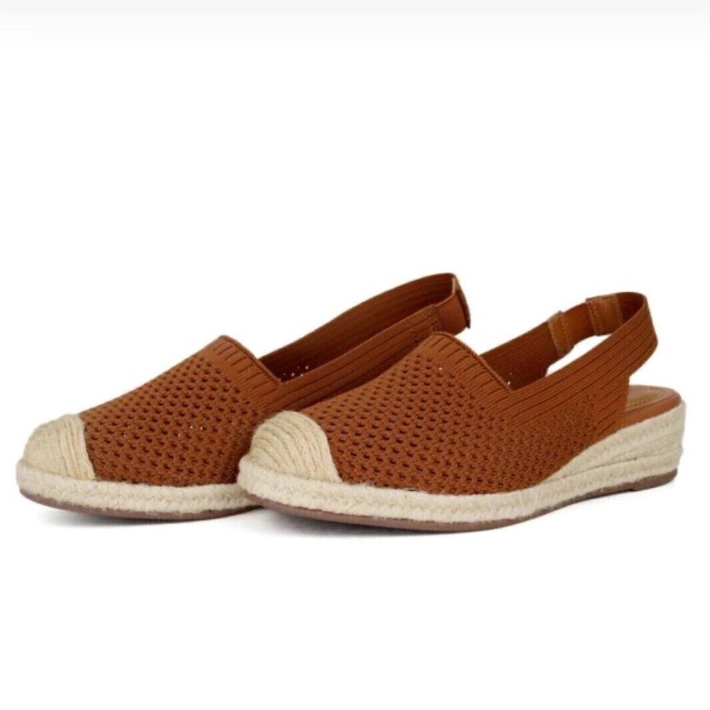 Sandália com cabedal em knit,elástico ajustável na lateral interna,acabamento em juta natural,palmilha acolchoada e revestida em couro macio,salto anabela com acabamento em corda,solado antiderrapante.