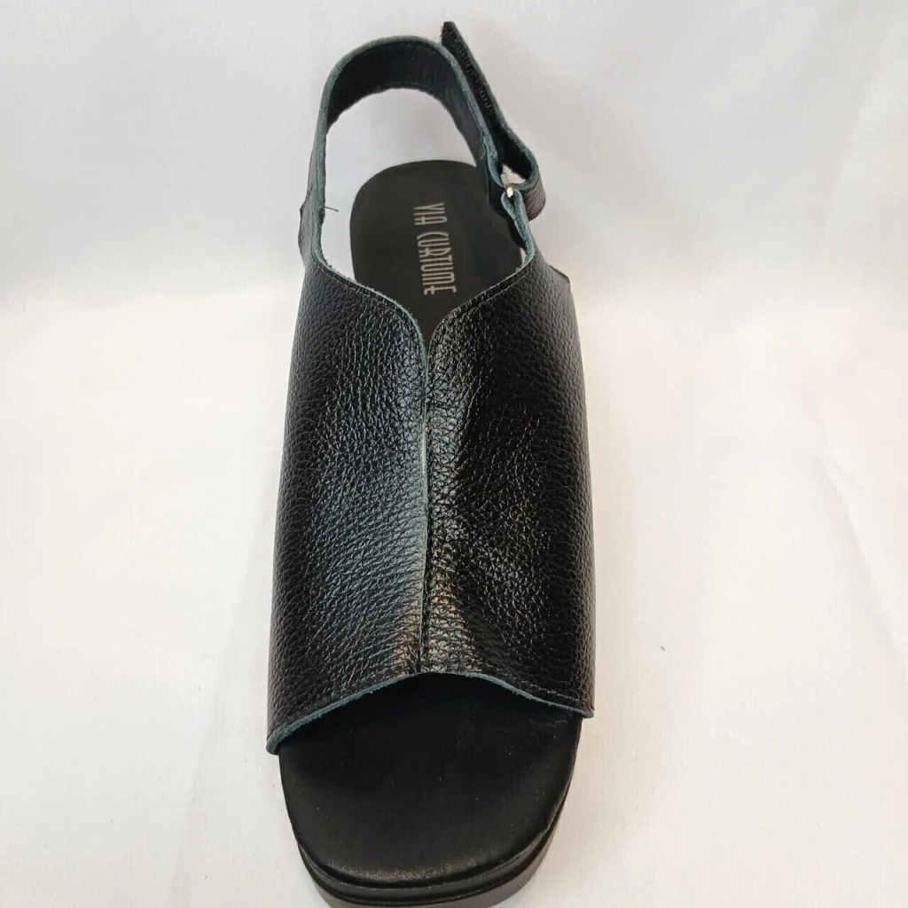 Sandália de couro floater,dedos livres,fecho em velcro na lateral externa,palmilha em couro macio,salto anabelado,solado em drive emborrachado.