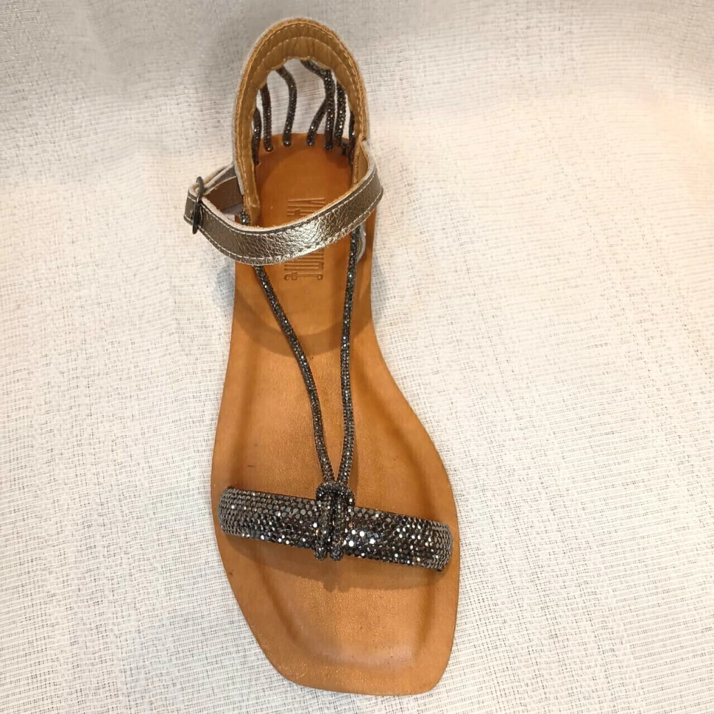 A Sandália de Couro com Aplicações em Nano Cristais é o toque de brilho e sofisticação que transforma qualquer look. Seu design moderno e elegante combina o luxo discreto dos nano cristais com a autenticidade e durabilidade do couro legítimo.