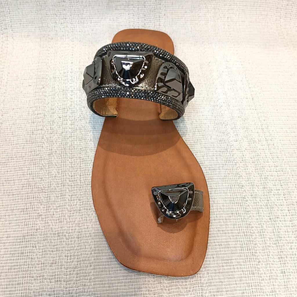 Sandália de couro com cabedal em pedrarias e nano cristais,dedos livres,frente quadrada,palmilha em couro macio,solado antiderrapante.