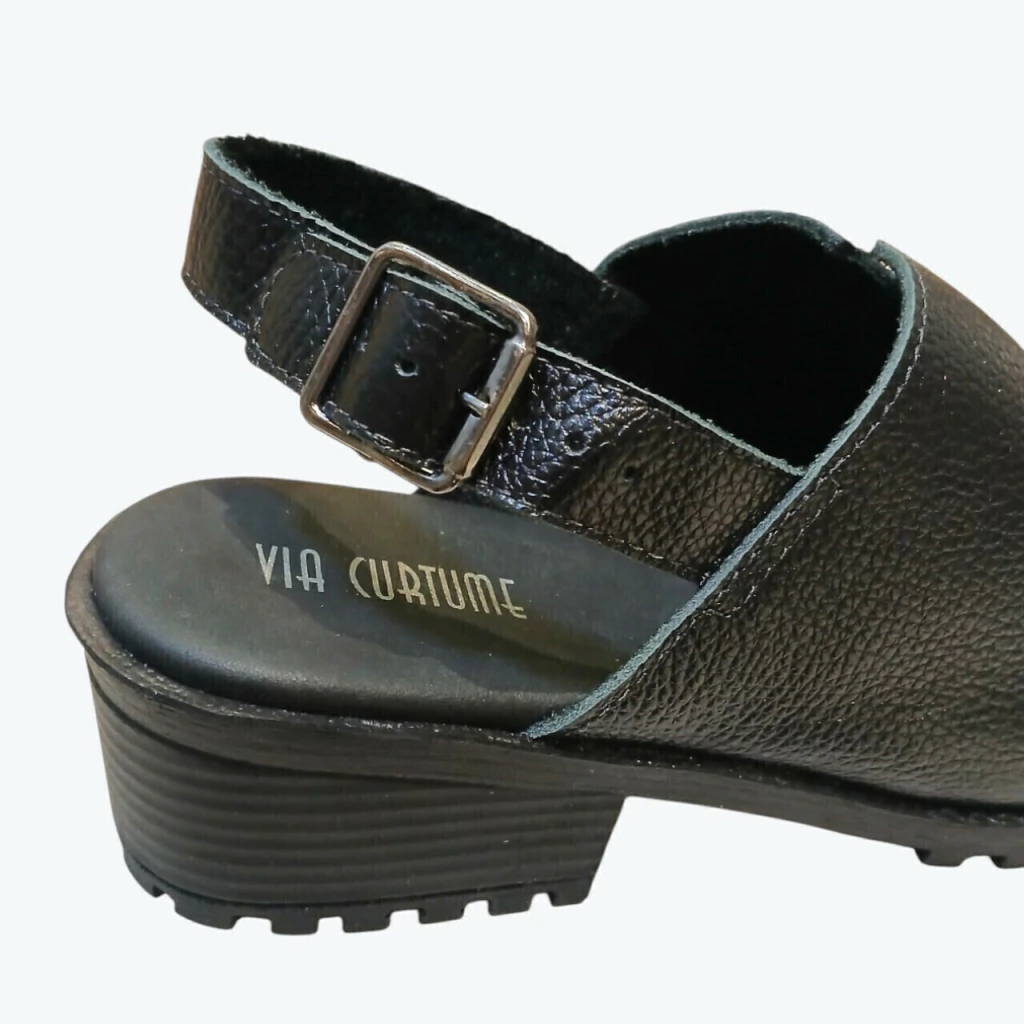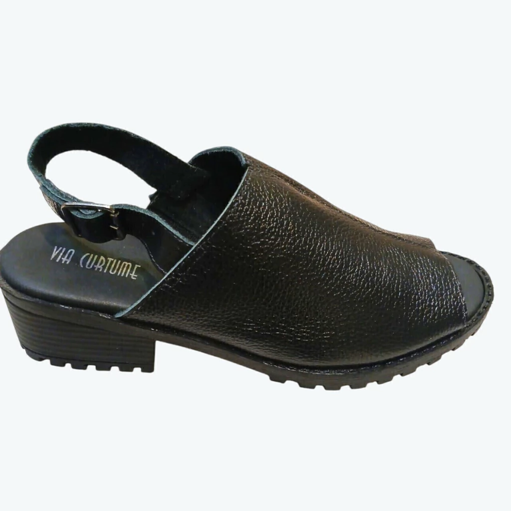 Sandália de couro floater,dedos livres,cabedal fechado,fecho em fivela na lateral externa,palmilha em couro macio,salto bloco médio,solado tratorado. Salto:4 cm