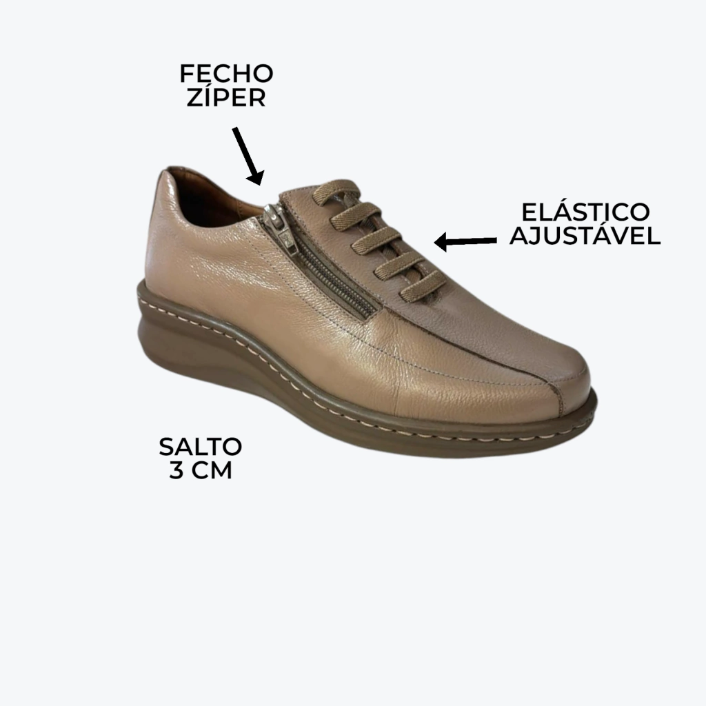 Tênis de couro,biqueira redonda,fecho lateral em zíper,forrado em couro macio,acompanha elástico ajustável,palmilha em couro macio,solado antiderrapante. Salto:3 cm